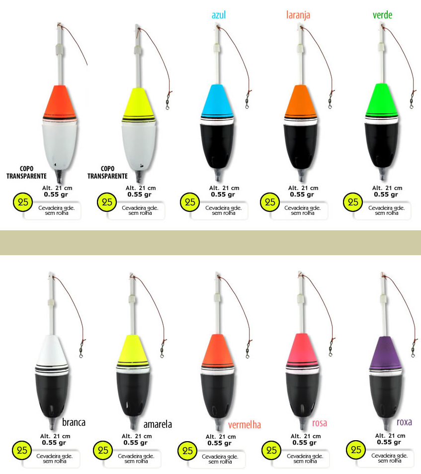 Boia cevadeira para grandes quantidades de ração. A ceva (ração flutuante) é colocada dentro do copinho plástico e liberada apenas quando a boia cai na água espalhando a ração em volta. Própria para ser usada em pesqueiros e locais onde os peixes estão acostumados a comer ração flutuante.